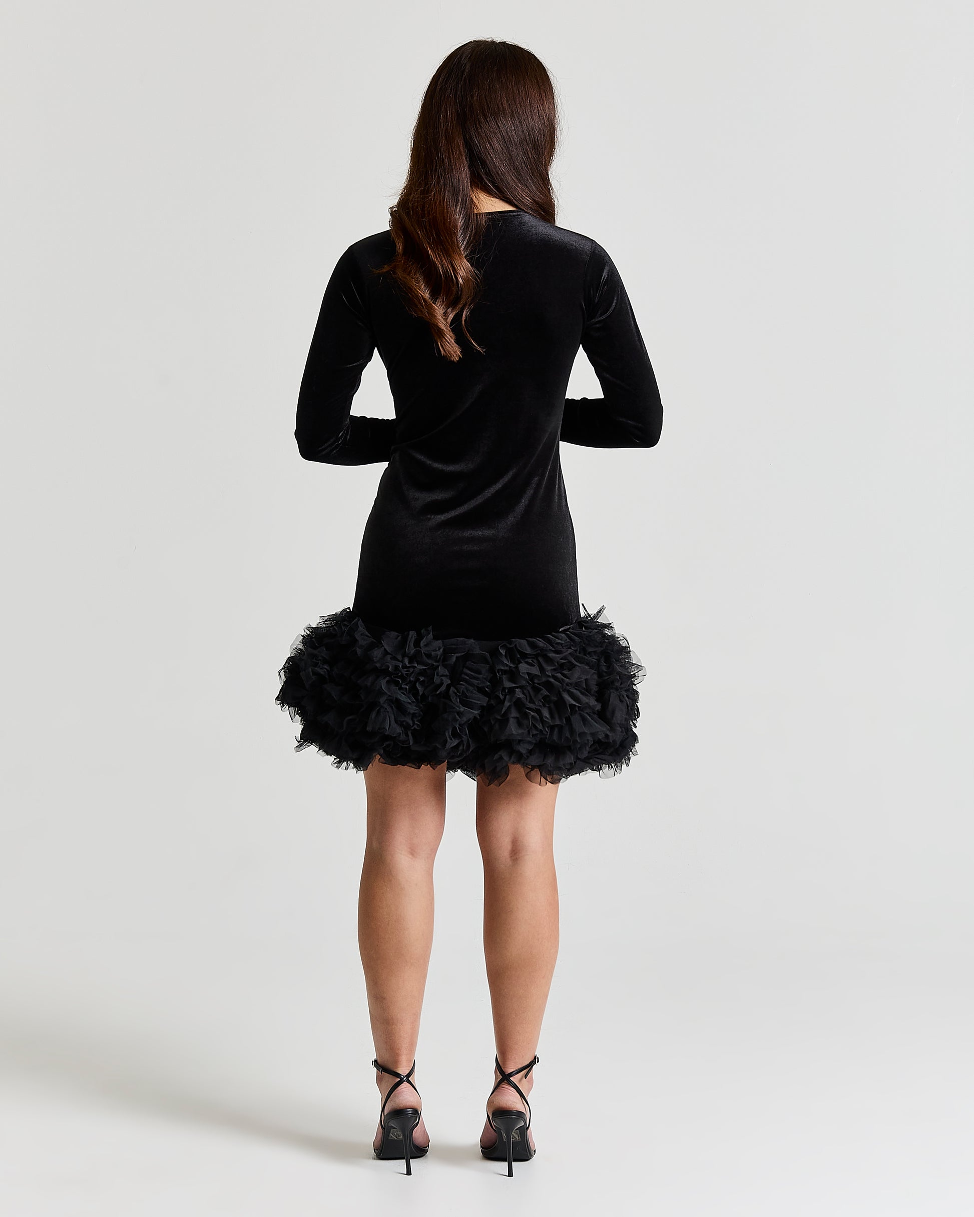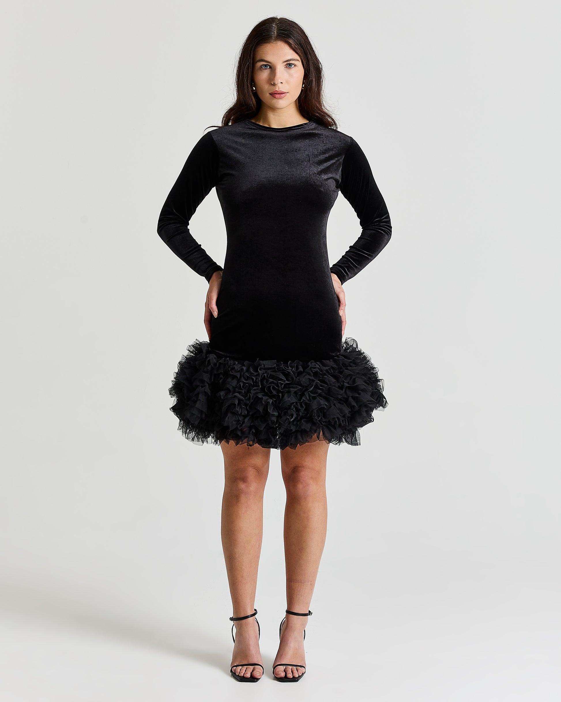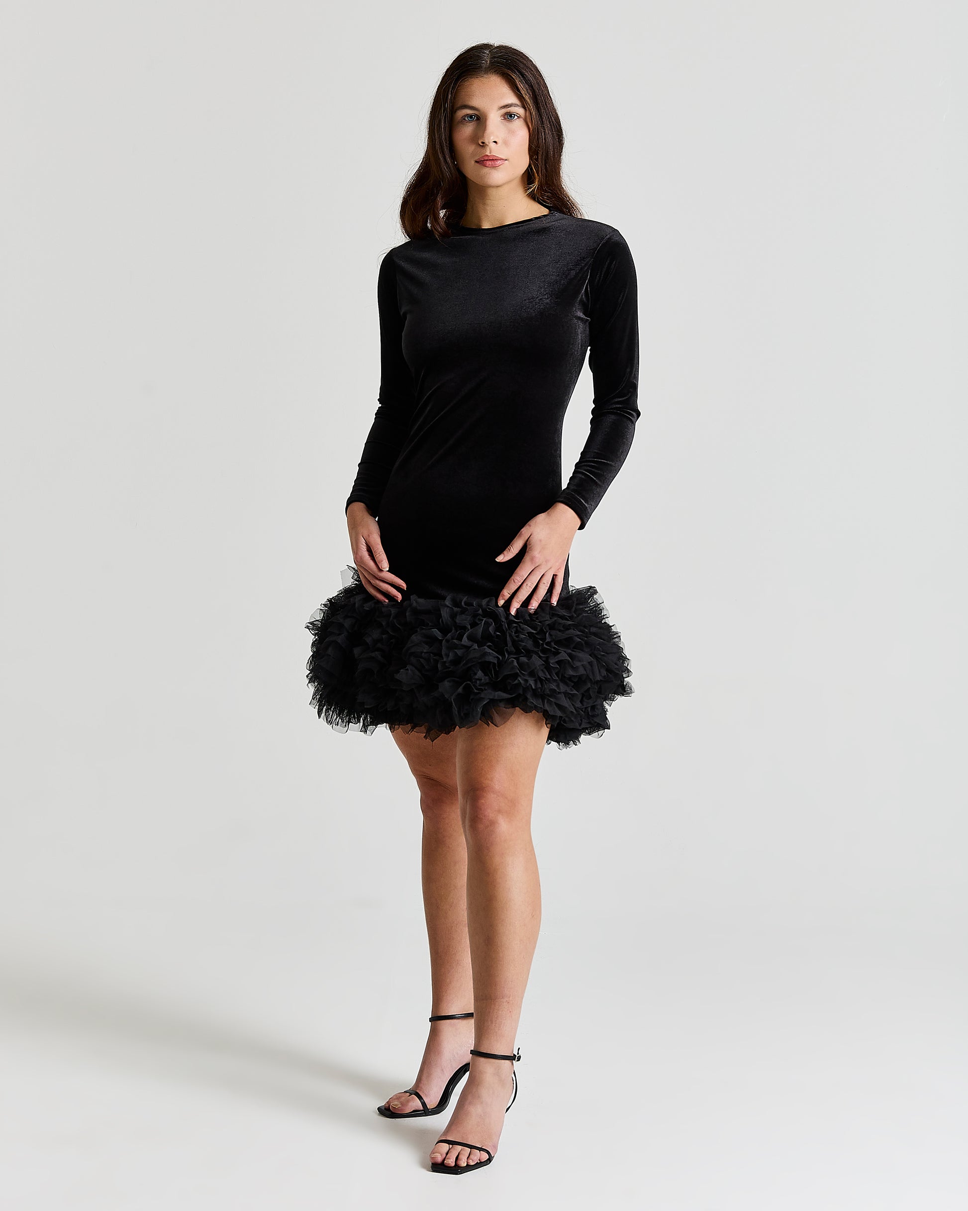Luxury Stretch Velvet | Body con fit | Lined in scuba | Tulle detail | Long sleeve | Round neck line
